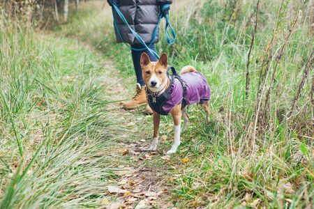 Woman is walking in a autumn forest with happy and friendly Basenji dog dress up in warm clothes. Dog is looking directly at the camera.