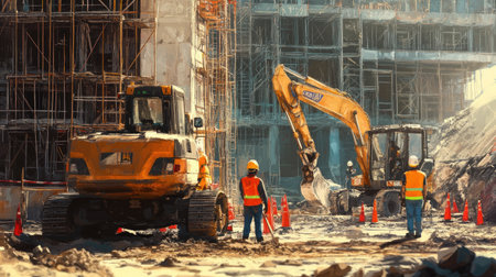 Construction workers in hard hats and safety vests operating heavy machinery on a building site, with scaffolding and partially built structures in the background.