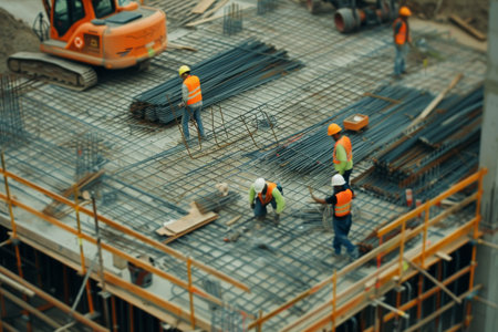 A group of construction workers in helmets and vests are actively engaged in reinforcing a concrete foundation on an urban construction site, ensuring safety and stability.