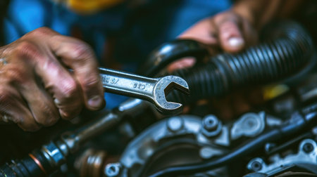 Auto mechanic hands using a wrench to service and repair a car engine in a garage workshop, close-up on tools, bolts and skilled maintenance work on vehicle components