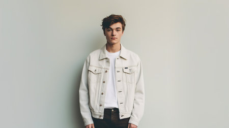A young man stands confidently in a casual outfit against a plain background, embodying the essence of modern streetwear and laid-back fashion trends.