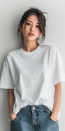 Asian woman posing confidently with hands in pockets, wearing an oversized white t-shirt and denim jeans, offering a versatile template for apparel design and fashion concepts