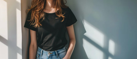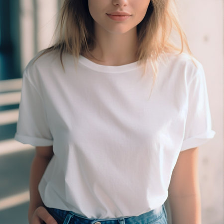 Young woman wearing white cotton t-shirt, styled photo, mock-up. Created with Generative AI technology