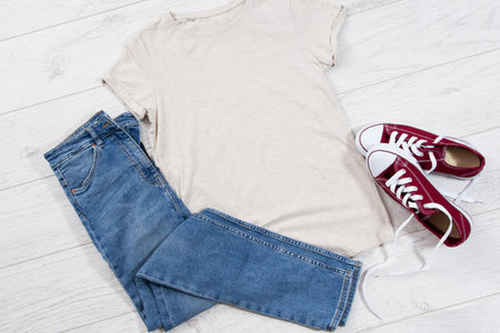 Casual clothes jeans, t-shirt, shoes. Fashion flat lay for website, social media