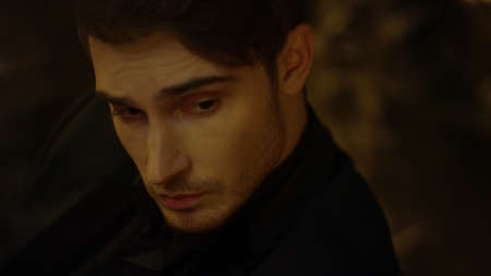 A man with a serious expression looks thoughtfully upwards, showing a moment of contemplation in soft lighting.