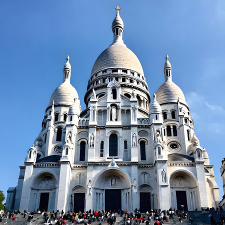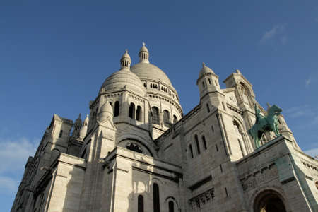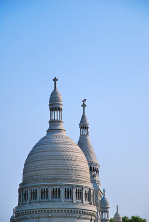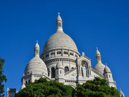 View from below of the Montmartre cathedral with its white domes on the blue sky