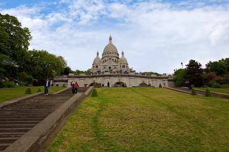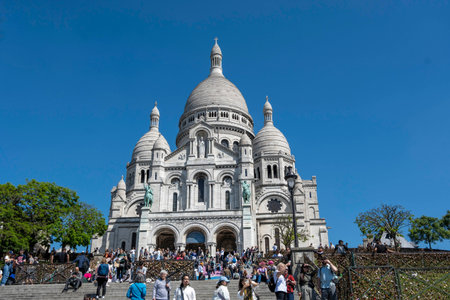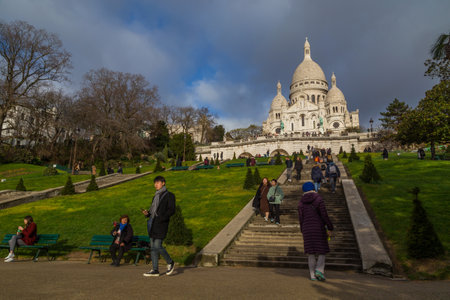PARIS, FRANCE - 28 APRIL, 2017: tourists walking near Sacre Coeur Basilica entrance, also known as Basilica of Sacred Heart. Situated in Montmartre, which is the highest 130 meters hill in Paris