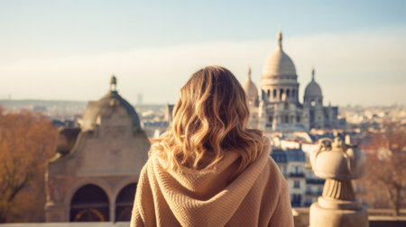 A beautiful young woman enjoying the view of Paris with the iconic Sacré-Cœur Basilica