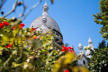 The cathedral of the Sacr?-C? Ur de Montmartre on the hill in Paris with unfocused green trees, bushes and red flowers in the foreground