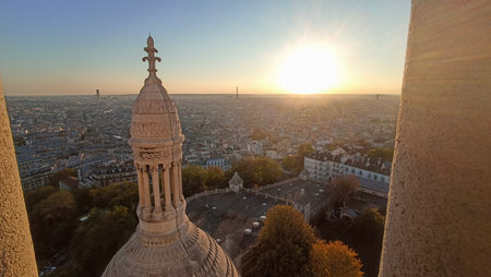 A panoramic view of Paris, France with the Eiffel Tower from the dome of the Sacre Coeur Basilica during the sunset
