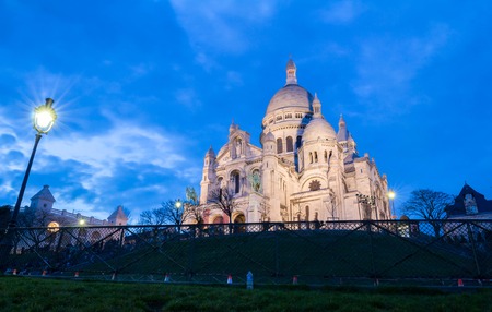 Sacre Coeur Cathedral at dusk in Paris, France.