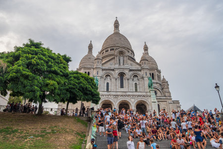Paris, France - August 7, 2018: Tourists on the steps to the church of Sacre-Coeur in Montmartre in Paris, France on a hot even if cloudy summer afternoon.