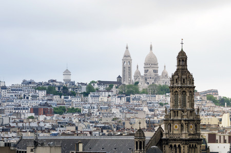 PARIS, FRANCE: Sacre-Coeur church, Paris citiscape view over the roofs with dramatic winter sky. France