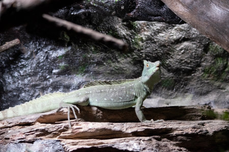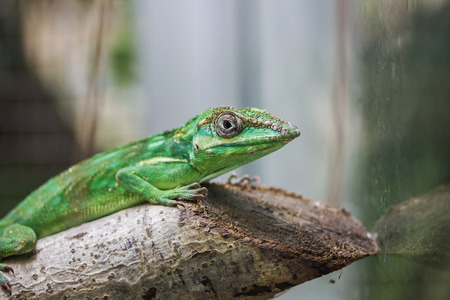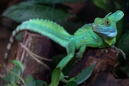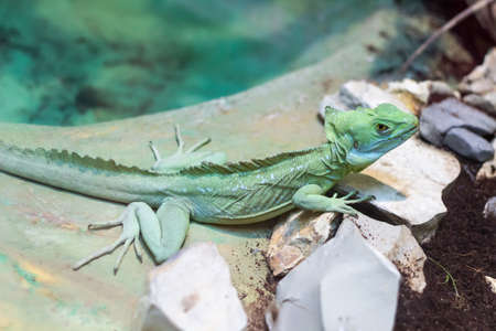 Green plumed basilisk in terrarium