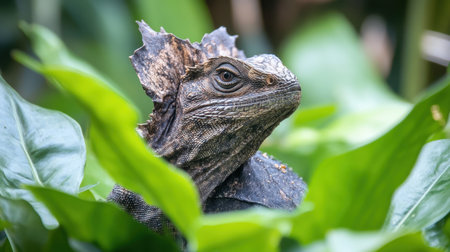 A stunning close-up of a lizard resting among vibrant green leaves, showcasing intricate textures and patterns. The image captures the essence of wildlife and natural beauty.