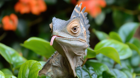 A stunning close-up of a lizard displaying delicate features and vibrant colors, perched among lush green leaves and bright blossoms in a tropical garden.