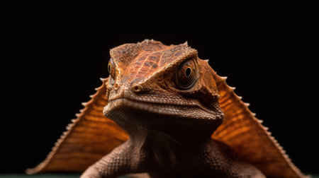 An AI generated illustration of a lizard posed against a solid black background and illuminated by a dark colored light source