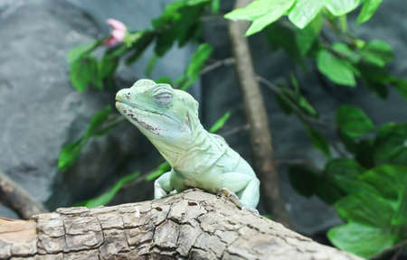green iguana climbs on the rocks in the terratium