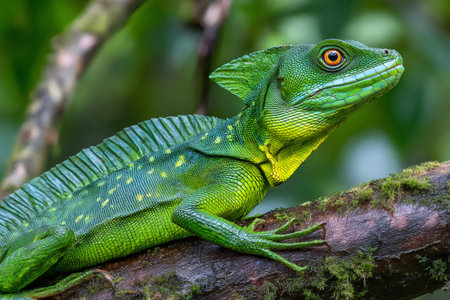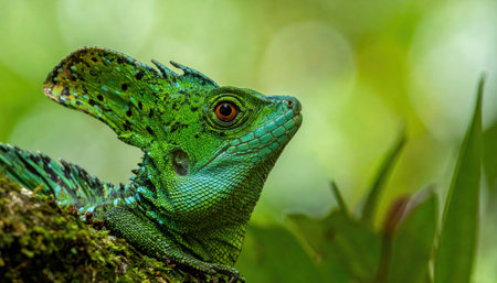 Close-up view of a green Plumed basilisk (Basiliscus plumifrons).
