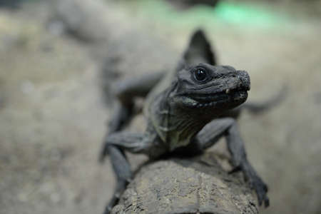 Amboina sailfin lizard on tree branch at herpetarium, closeup