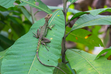 A brown basilisk (Basiliscus vittatus) or the common or striped basilisk lizard on a large leaf in the rainforest.