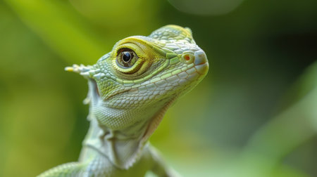 Lizard with green scales and yellow eyes in nature - Image