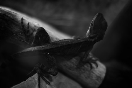 Black and white photography of a reptile, close-up of a wild reptile