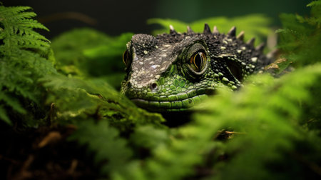 Tuatara, an ancient reptile native to New Zealand. The tuatara is surrounded by lush green ferns, close-up portrait. AI-generated