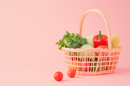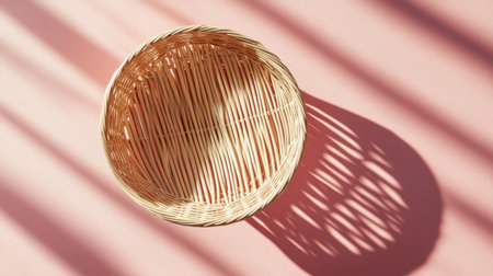 A beautifully crafted empty wicker basket sits on a soft pink background. The natural light casts gentle shadows, emphasizing the texture and craftsmanship.