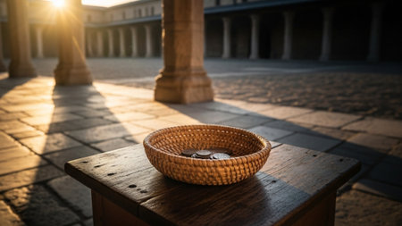 An ultrawide 16:9 environmental photograph capturing a simple, rustic woven donation basket placed o