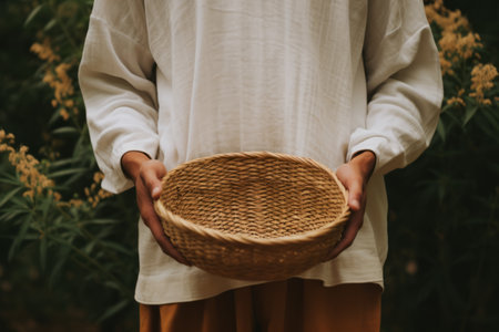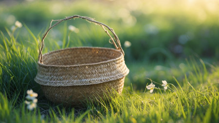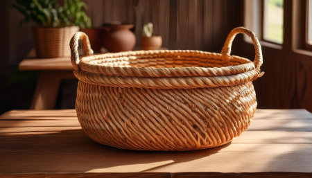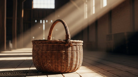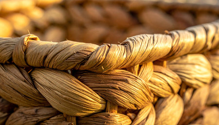 Golden sunlight catches the intricate details of a handwoven basket, highlighting the rustic texture and traditional craftsmanship.