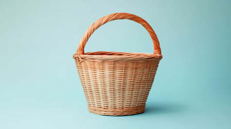 This image features a beautifully woven wicker basket with a graceful curved handle against a soft blue background, ideal for home decor and storage ideas.