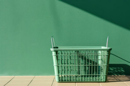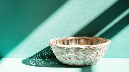 A minimalist woven basket rests on a light green surface, casting delicate shadows. The composition highlights a calm and artistic atmosphere perfect for interior decor.