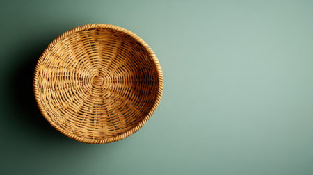 This image features a rustic woven basket placed on a smooth mint green surface. The empty round basket highlights craftsmanship and natural materials, perfect for various design and decoration themes.