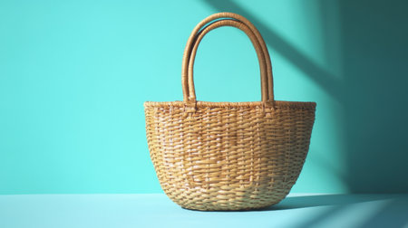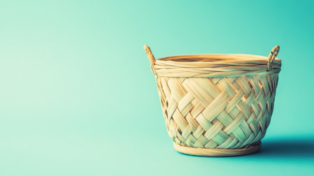 This image features an empty wicker basket set against a vibrant teal background, perfect for showcasing minimalist design and natural textures in various creative projects.