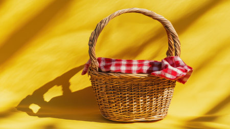 This image features a woven straw basket lined with a red checkered cloth, set against a vibrant yellow background, creating a warm, inviting atmosphere.
