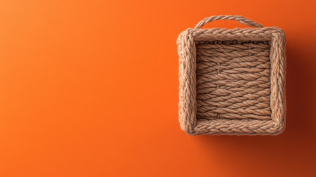 This image features a woven rope basket on a bright orange surface, showcasing a simple and elegant design, perfect for decor or organization.