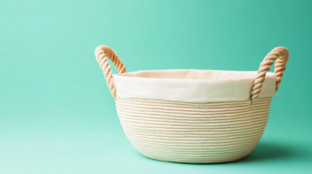 A cozy cotton storage basket featuring rope handles, set against a soft teal background. Ideal for home organization and adding a touch of style to any space.