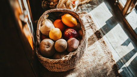 A beautifully arranged basket filled with fresh seasonal fruits rests on a sunlit wooden floor, creating a warm and inviting atmosphere in a cozy interior space.