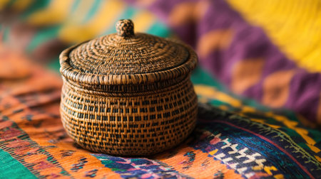 This image features a beautifully handcrafted woven basket with a lid, showcased on a vibrant and colorful textile background, reflecting rich cultural craftsmanship.