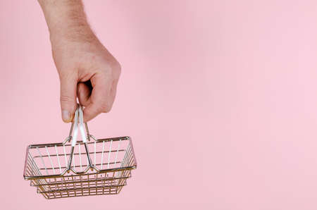 A hand and an empty shopping basket on a pink background. Man holding a small metal basket. Retail, commerce concept. Side view. Close-up. Selective focus.