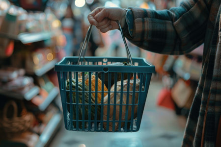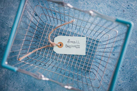 product tags with small business text with customer shopping basket, concept of consumer behaviour and supporting small local businesses