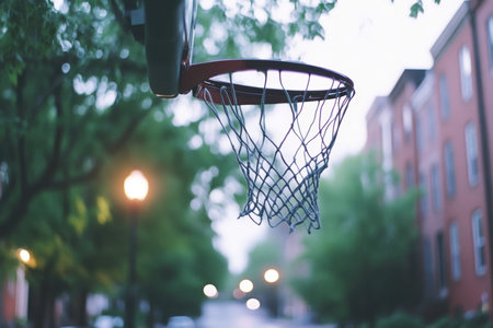 A basketball net is hanging from a hoop. The net is empty. The sky is blue