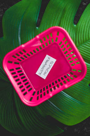 buying sustainable products concept of ecoogy and consumer behaviour, empty pink shopping basket with text on top of tropical green leaf