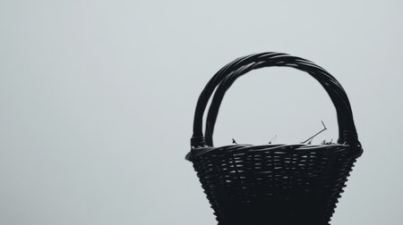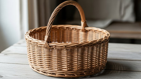 A simple wicker basket sits empty on a light wooden table against a neutral background creating a minimalist aesthetic perfect for decor.