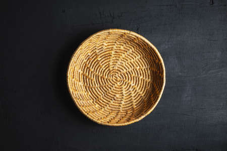 Wicked banana leaves basket recycling handmade product. handicraft and eco sustainable plate. organic compostable tableware. zero waste concept. selective focus