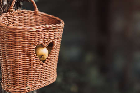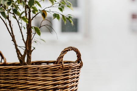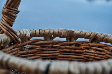 Close-up details of the basket, soft selective selective focus. Twisted bars woven with each other, basket, bow.