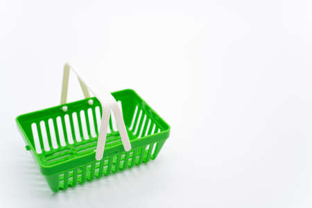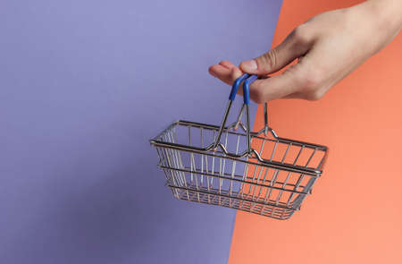 Shopping concept. Female hand holds mini shopping basket on colored background
