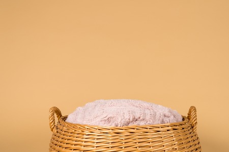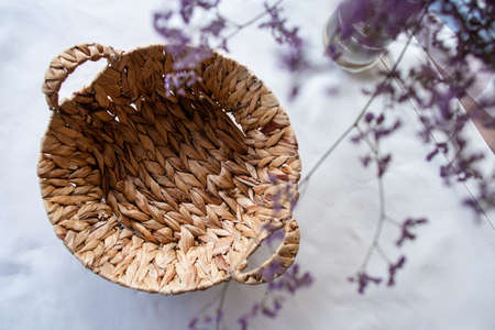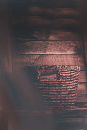 Empty wicker basket. Basket in bathroom. Vintage wicker basket