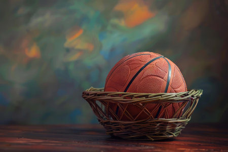 Basketball is sitting in a wicker basket on a wooden surface, with a colorful background